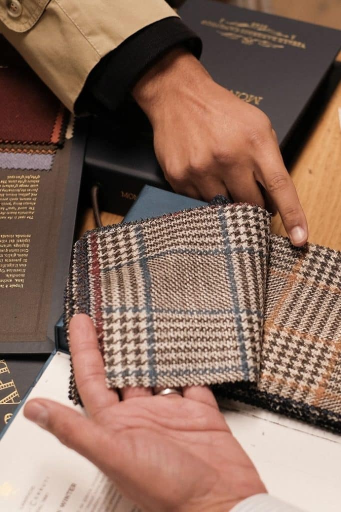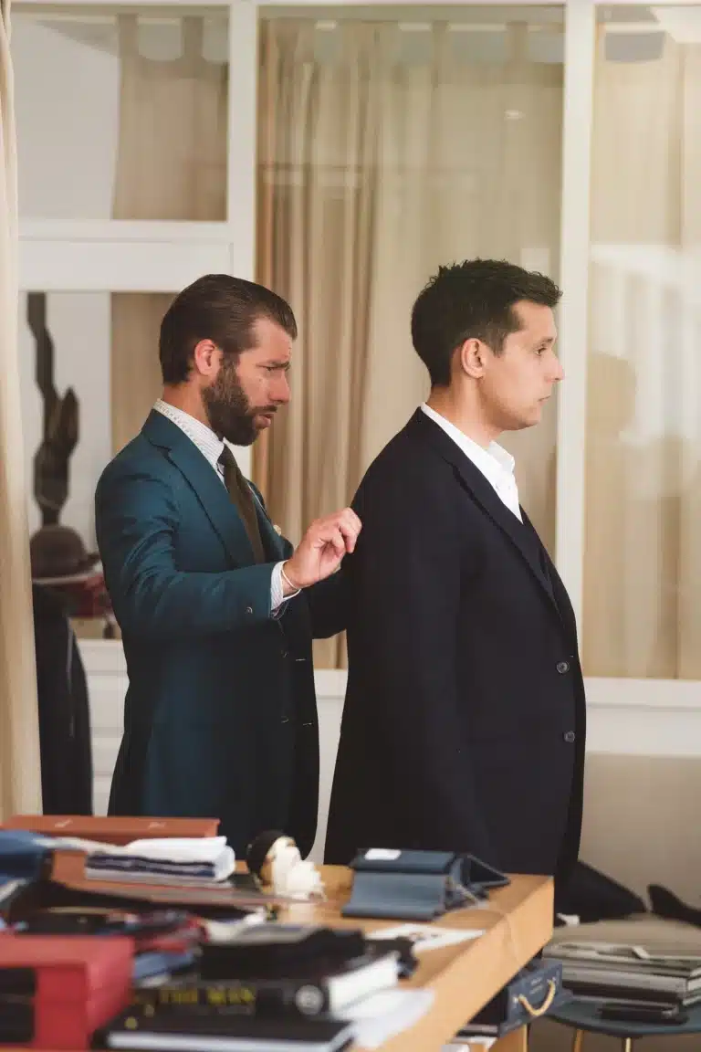 Quand on va faire un costume sur mesure, on ne voit pas son vêtement à l’avance et on ne peut pas l’essayer – j’enfonce une porte ouverte bien sûr, mais c’est important de se remettre ça en perspective quand on envisage la chose pour la première fois. Par conséquent, la personne avec qui on va travailler est d’une importance capitale. C’est elle qui va prendre les mesures, analyser la morphologie, traduire vos envies de coupe et de fit, proportionner les pièces et assurer que les choix fonctionnent – les couleurs entre elles, les tissus entre eux, les coupes entre elles, etc. – pour ensuite l’envoyer en confection à l’atelier.